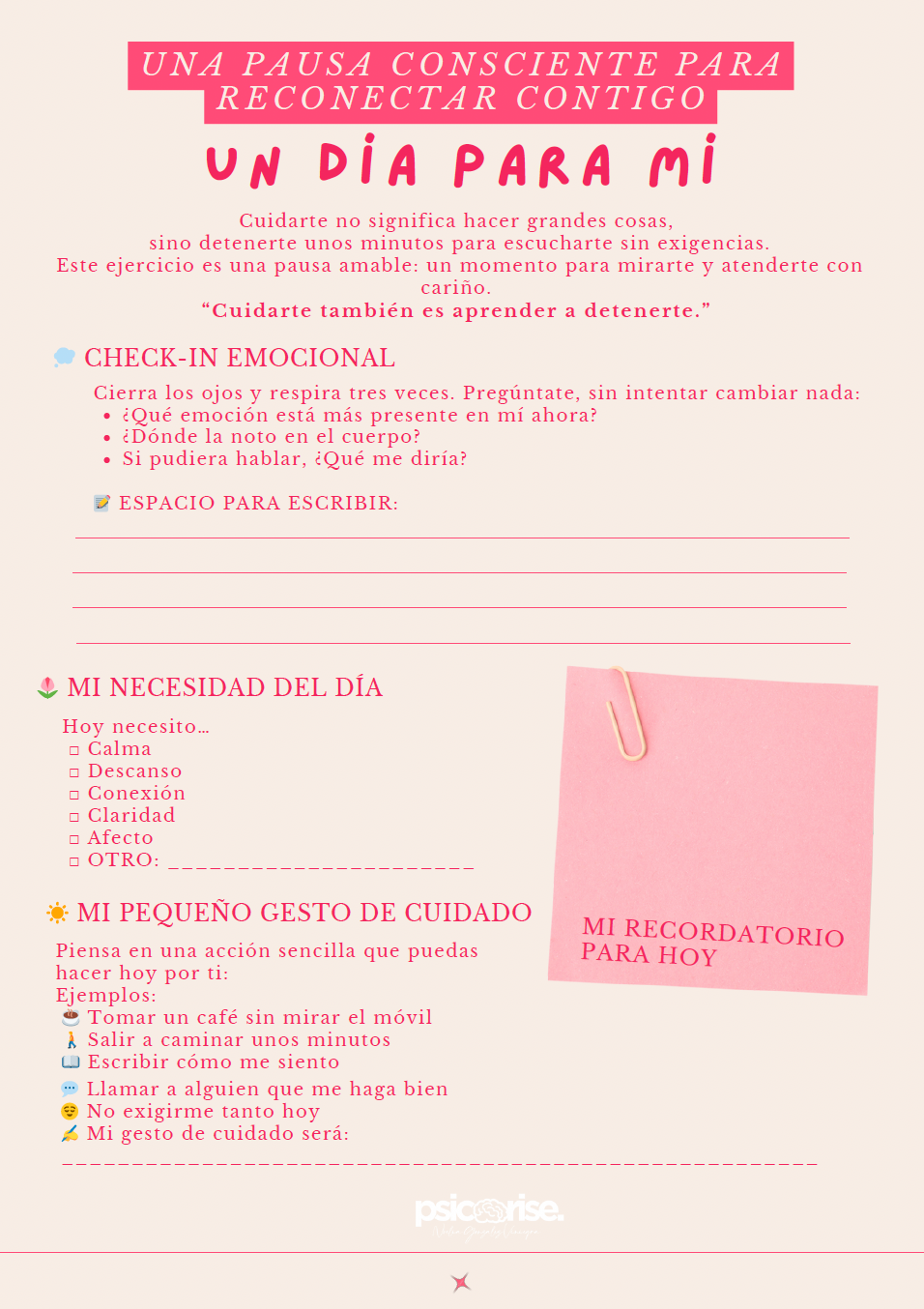 3. Mi Pequeño Gesto de Cuidado : Una vez identificada la necesidad, el ejercicio te pide pensar en una acción sencilla que puedas hacer hoy por ti. Encontrarás ejemplos como tomar un café sin mirar el móvil, salir a caminar unos minutos, o simplemente proponerte no exigirte tanto hoy.